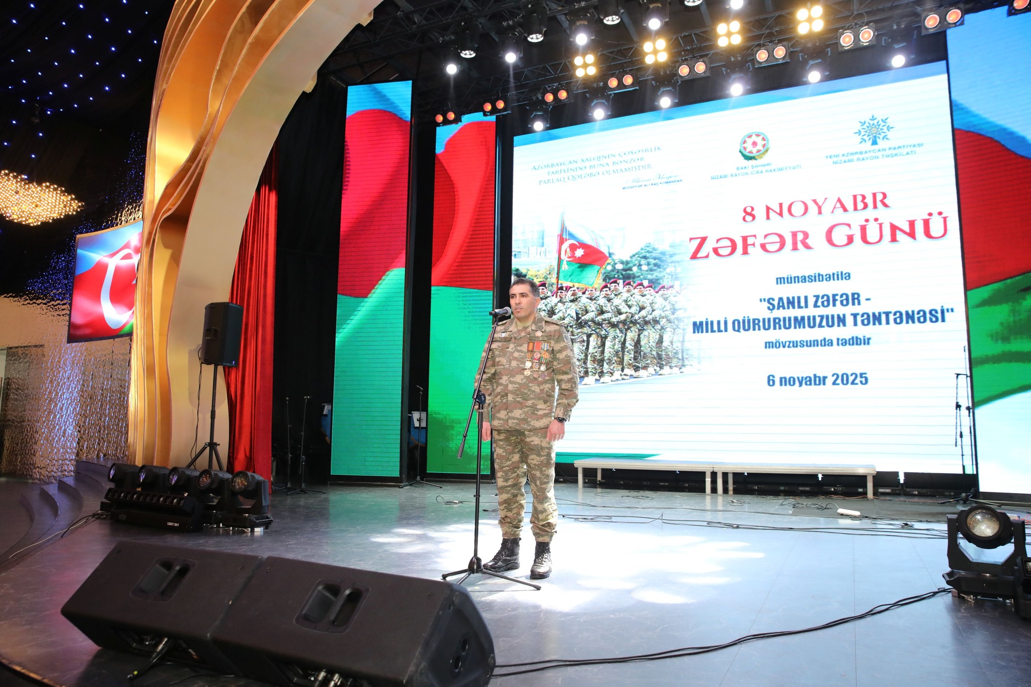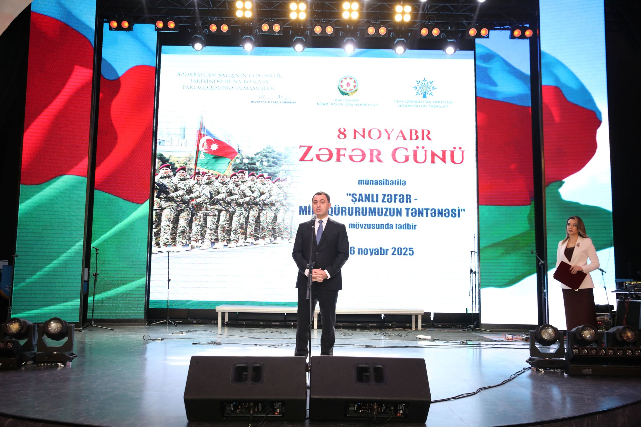 Bu gün Nizami Rayon İcra Hakimiyyəti və YAP Nizami rayon təşkilatının birgə təşkilatçılığı ilə 8 Noyabr – Zəfər Gününün 5-ci ildönümü münasibətilə millət vəkillərinin, geniş rayon ictimaiyyətinin, şəhid ailələrinin, qazilərin və gənclərin iştirakı ilə "Şanlı Zəfər – milli qürurumuzun təntənəsi" adlı ümumrayon tədbirində iştirak etdik.