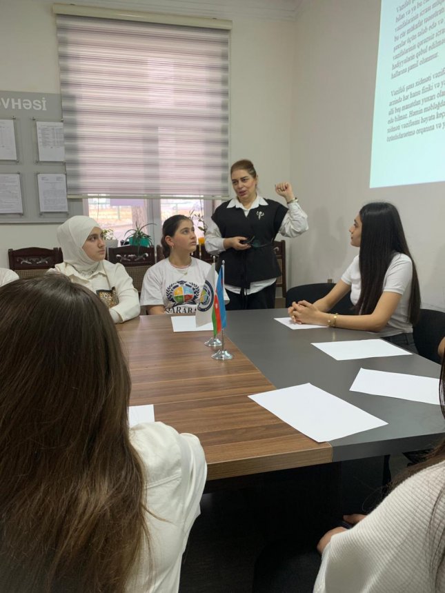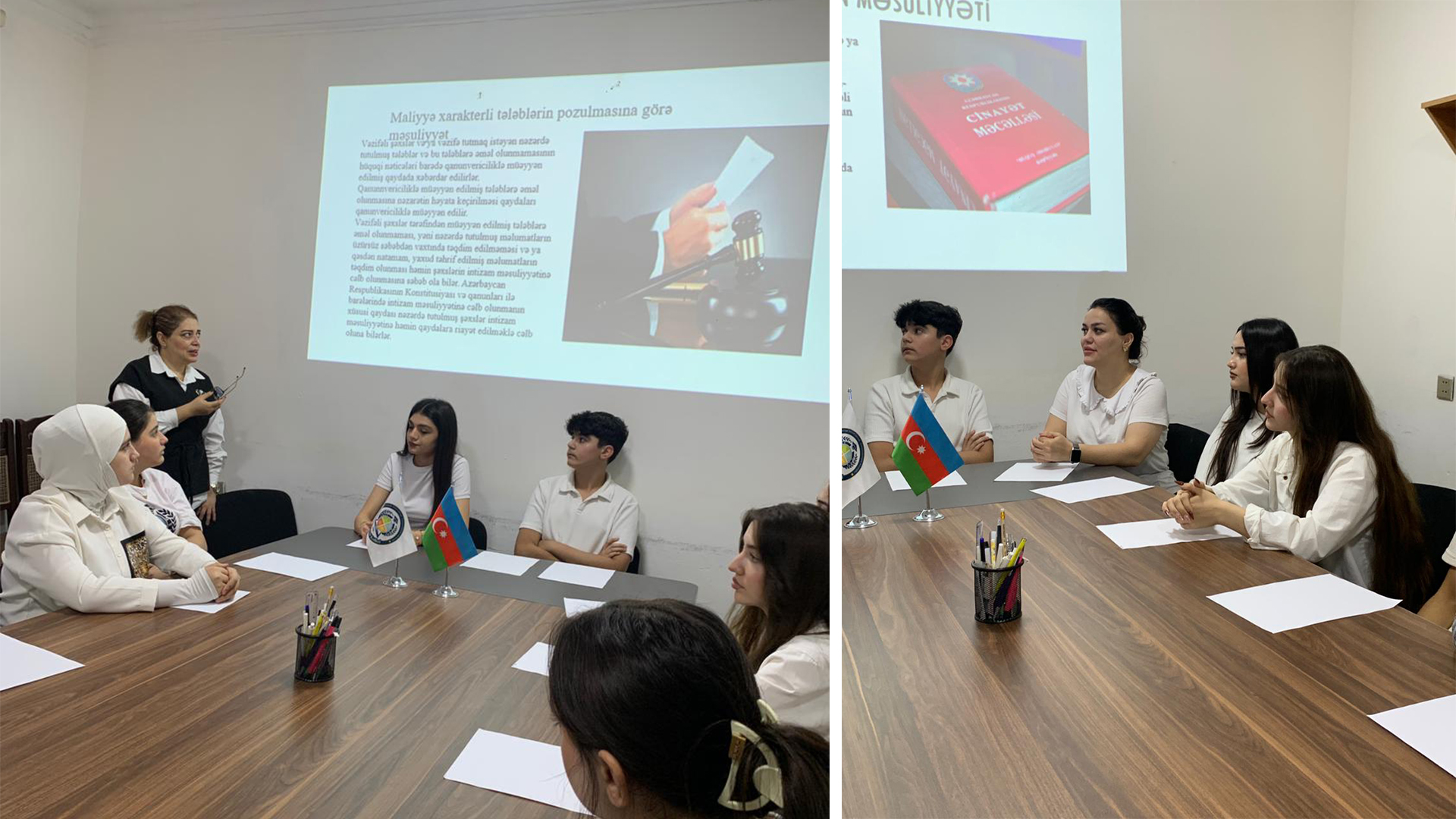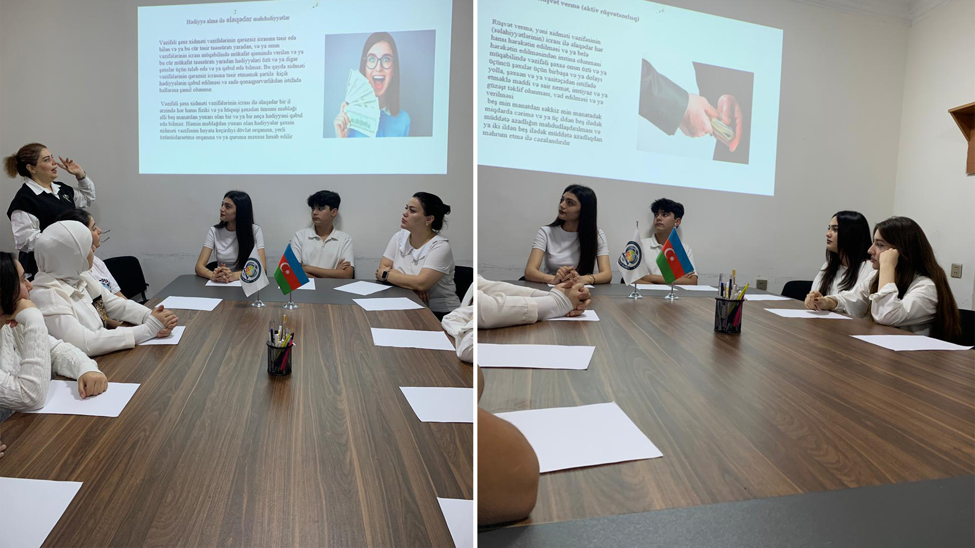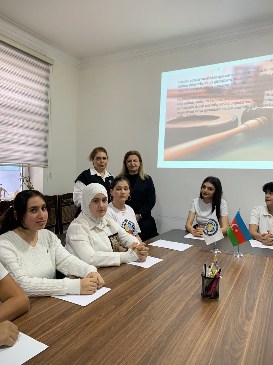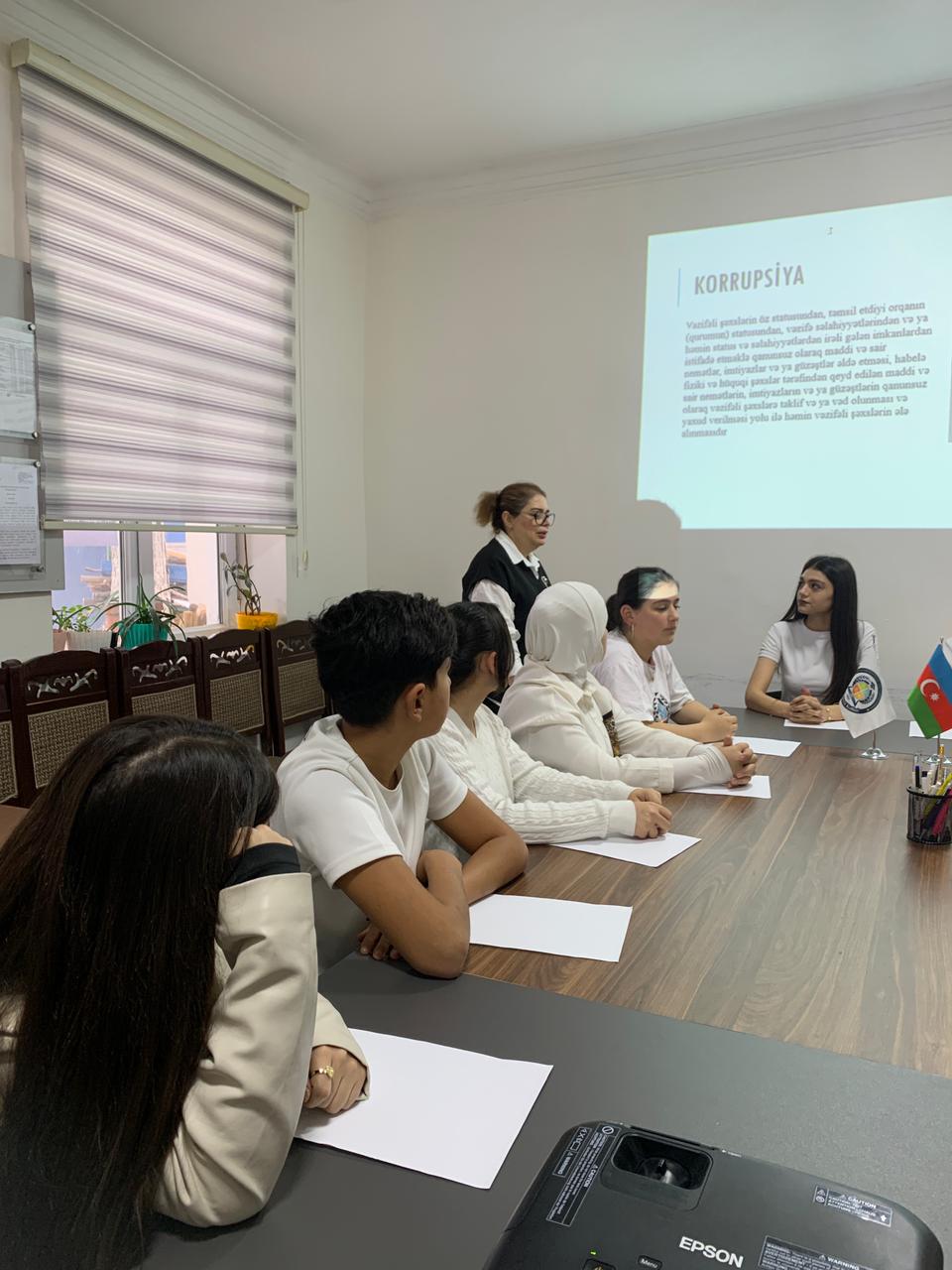 Məmmədova Xatirə korrupsiyanın növləri, qanunvericilikdə nəzərdə tutulan məsuliyyət və korrupsiya halları ilə rastlaşdıqda hansı addımların atılması barədə geniş izah vermişdir. Tələbələr mövzu ilə bağlı suallarını ünvanlamış, problemlərin həlli yolları müzakirə edilmişdir.