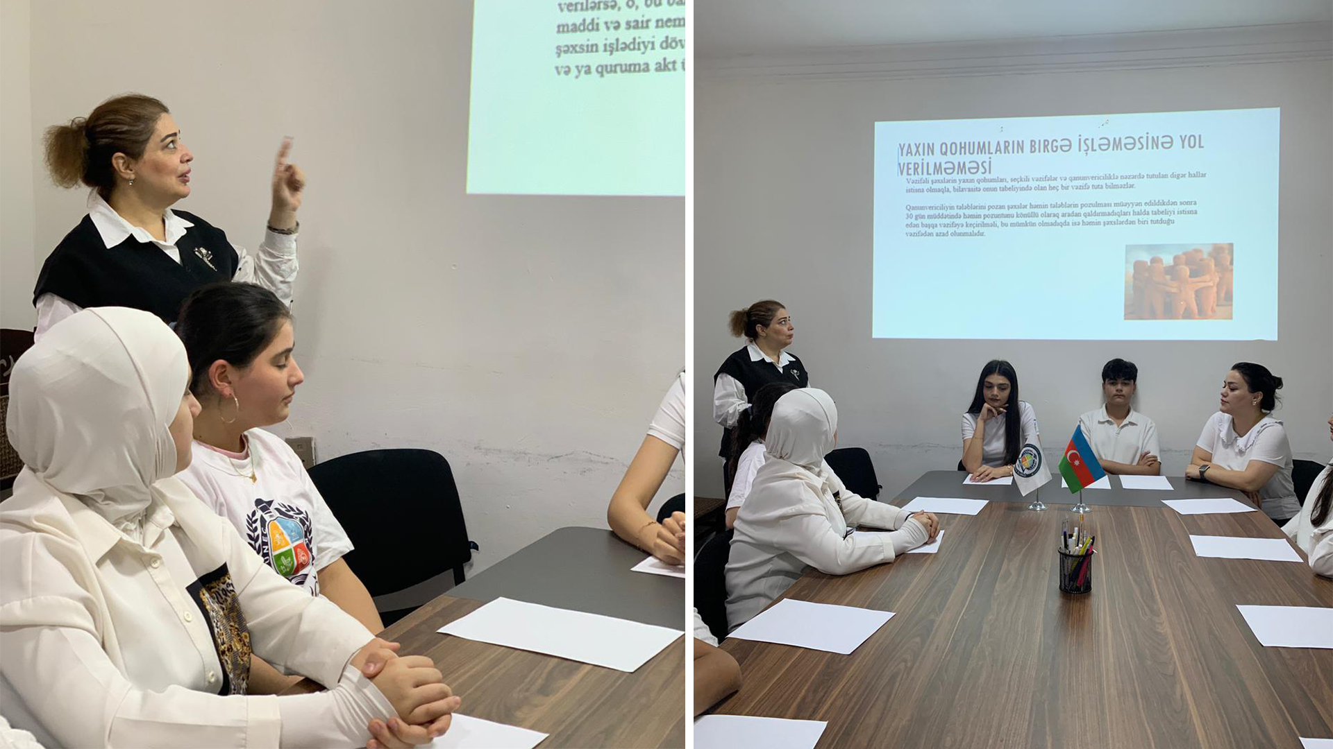 Kollecin hüquq müəllimi Məmmədova Xatirə tərəfindən “Korrupsiya və onun qarşısının alınması yolları” mövzusunda dəyirmi masa təşkil edilmişdir. Tədbirin məqsədi tələbələrdə hüquqi maarifləndirməni artırmaq, korrupsiyanın cəmiyyətə vurduğu mənfi təsirlər barədə məlumatlandırmaq və şəffaf, ədalətli mühitin formalaşmasına dəstək olmaq idi.
