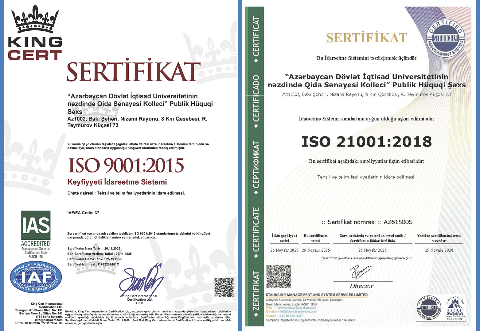 - ISO 21001:2018 isə təhsilimizin keyfiyyətinə, tələbə məmnuniyyətinə və tədris metodlarının beynəlxalq standartlara uyğunluğuna zəmanət verir.