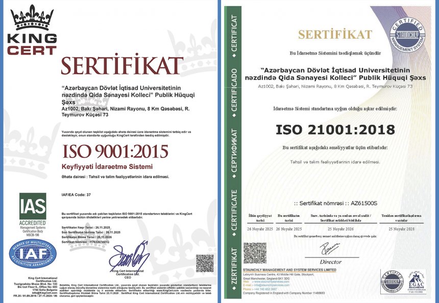Kollecimiz beynəlxalq keyfiyyət standartları üzrə sertifikatlar əldə edib